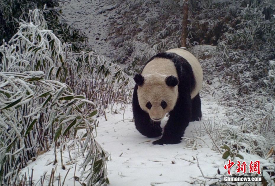 3月31日,四川马边大风顶国家级自然保护区管理局通报,工作人员整理野外收回的131台红外相机数据时,发现永红保护站14台红外相机拍摄到了大熊猫活动影像。其中一段视频还拍到了大熊猫用尿液标记领地行为。图为红外相机拍摄雪地中行走的野生大熊猫。中新社记者 钟欣 摄