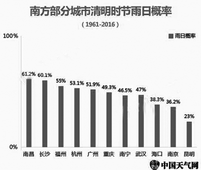 除了正处于干季的云南之外,长江中下游地区及其以南地区在清明时节的雨日普遍过半。代表江南地区的长沙、南昌出现雨日的概率更是超过60%。代表华南地区的福州、广州,因为4月份往往是华南前汛期的开始,下雨天会逐渐多起来。
