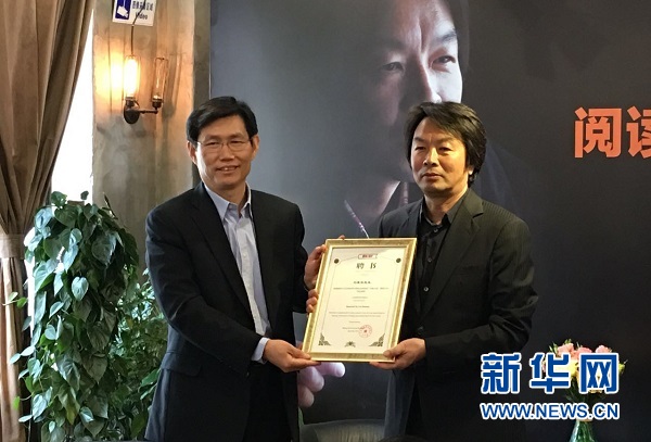中国图书进出口(集团)总经理张纪臣向刘震云颁发聘书。新华网 王志艳 摄