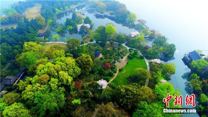 4月5日,航拍的花港观鱼。花港观鱼是杭州西湖十景之一,宛若天成的牡丹园、平静如画的小南湖、热闹欢腾的红鱼池。每个到过花港观鱼的人,都会被其旖旎的景色所折服。