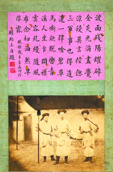 “最开始,我们只知道这张照片年头儿早,却不知道早到什么时候。”泄露了“天机”的,是照片上部奕譞的一首自题诗:“波面残阳耀碎金,炎光消尽觉凉侵。莫言倥偬三军事,也得逍遥一律唫。碧草马嘶欣脱辔,青溪人坐乍开襟。云容糺缦随风布,念切油然早作霖。——晚操后步至长河作,醇郡王自题。”