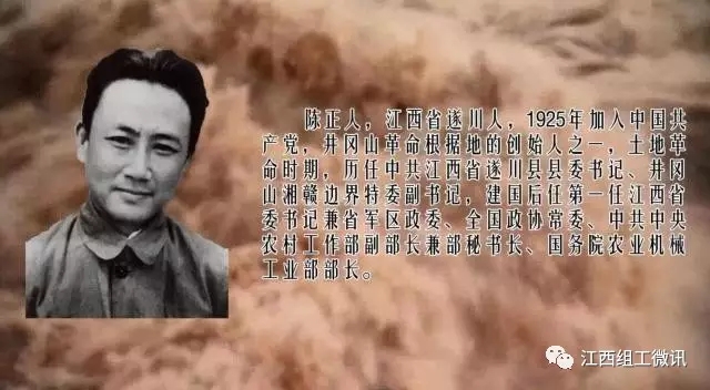陈正人,江西省遂川人,1925年加入中国共产党,井冈山革命根据地的创始人之一,土地革命时期,历任江西省遂川县县委书记、井冈山湘赣边界特委副书记,1946年任中共吉林省委书记兼省军区政委,建国后任第一任江西省委书记兼省军区政委、全国政协常委、中共中央农村工作部副部长兼部秘书长、国务院农业机械工业部部长。