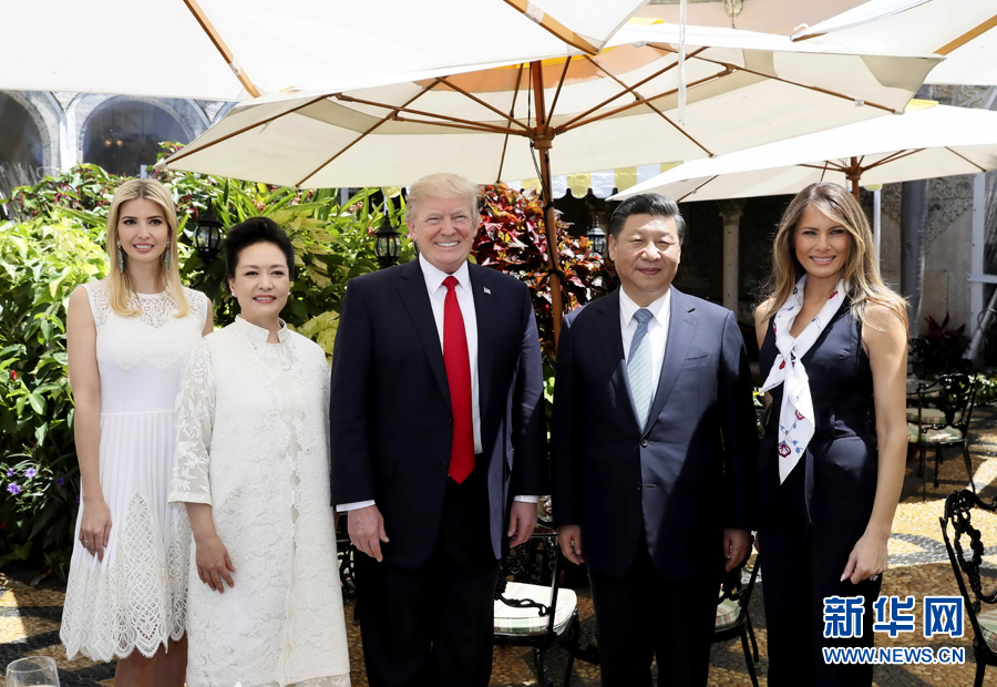 当地时间4月7日,国家主席习近平在美国佛罗里达州海湖庄园同美国总统特朗普举行中美元首第二场正式会晤。这是习近平和夫人彭丽媛同特朗普和夫人梅拉尼娅、女儿伊万卡在庄园内合影。新华社记者 兰红光 摄