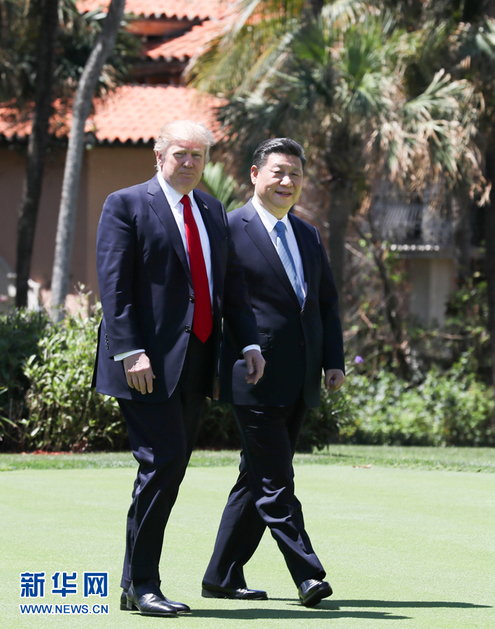 当地时间4月7日,国家主席习近平在美国佛罗里达州海湖庄园同美国总统特朗普举行中美元首第二场正式会晤。会晤后,习近平同特朗普到秀丽宜人的海湖庄园中散步,在轻松友好的气氛中继续就两国友好合作进行讨论。新华社记者 兰红光 摄