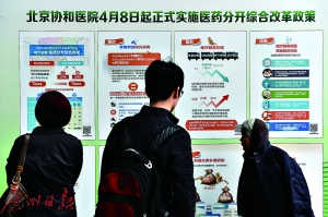 昨日,市民在北京协和医院观看北京医改相关介绍。 新华社图