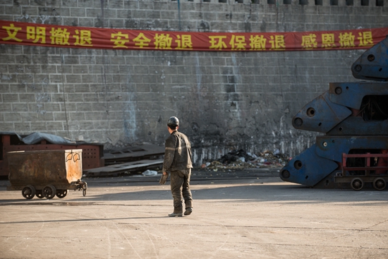 2016年10月19日,同家梁煤矿8号斜井井口,工人正在将井口关闭。图片均为王伟伟/摄