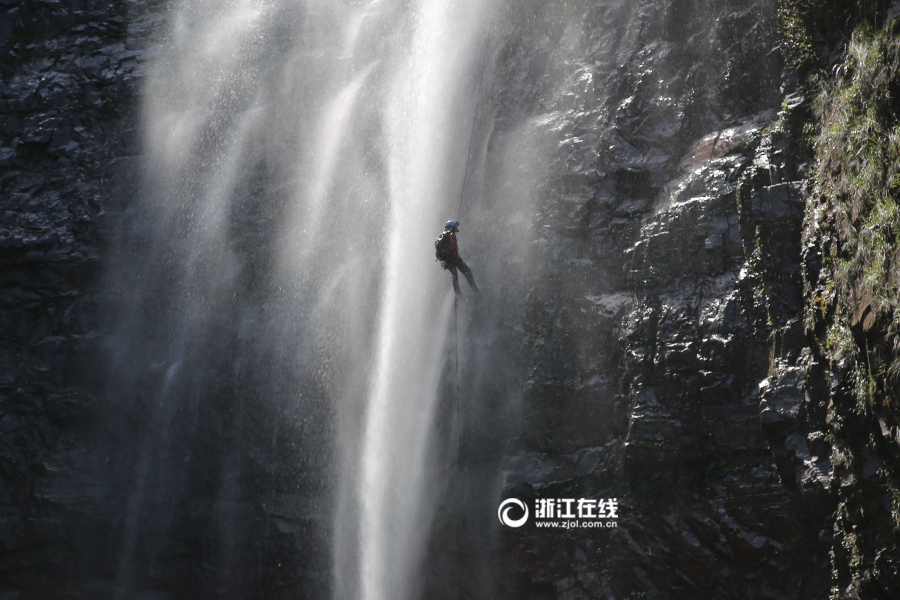 4月14日上午,10余名瀑降爱好者在泰顺红岩瀑布进行瀑降。爱好者凭借腰间一根绳索,从60多米高的悬崖上体验“飞流直下”的快乐。