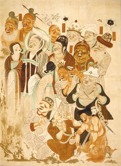 对此,作为展览重要展出部分的从克孜尔到敦煌再到麦积山的佛教艺术,做出了很好的诠释。就艺术性而言,三地佛教壁画和造像风格的并置展出,呈现出了佛教艺术从西域风向汉风转变这一逐渐本土化的过程,如展出的麦积山石窟造像,从造型到服饰已然具备了魏晋风度。就题材内容而言,宗教艺术也实现了与世俗生活的关联性。例如敦煌莫高窟158窟壁画《举哀图》,既真实地显示出各国不同的哀悼风俗,或割耳、或剖胸、或刺腹;又通过帽子服饰反映出唐朝与他国的密切交往以及各自的文化生活。基于印度、犍陀罗和汉文化等多种文化的相互交融,三地的佛教艺术拥有了丰富的面貌。