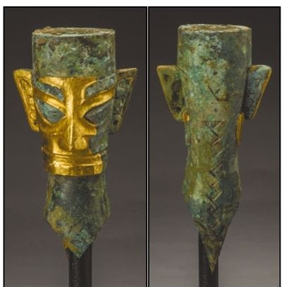 四川三星堆出土的商代“戴金面罩青铜人头像”。