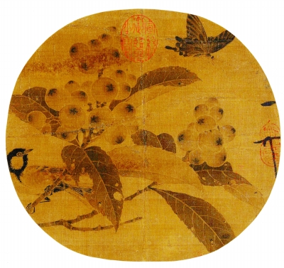 绢本圆形纨扇页《枇杷山鸟图》传为宋徽宗赵佶手笔。构图左下至右上、左上至右下两线交叉于中心偏左位置。主要物体都安排在左下至右上对角线以左,相对满密,右边小簇果实及叶片使整体画面平衡、疏密有致。左边山鸟的回眸姿态不仅与右上蝴蝶呼应聚拢观者视线,也与蝶的飞行动向在扇的上缘划出无形的弧线,为画面增添韵律感。
