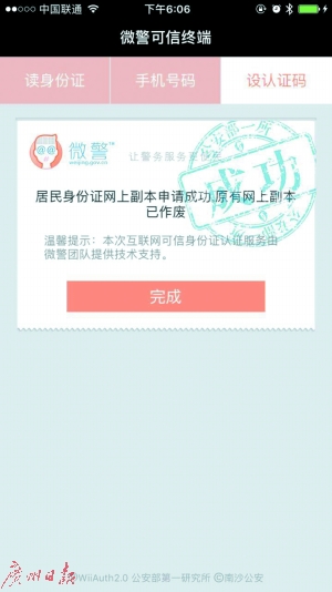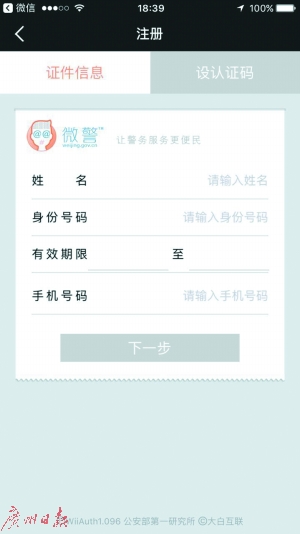 “微警认证”解决的一个核心问题就是身份证被冒用盗用,即别人拿了你的身份证去办业务,人证不一。据了解,“微警认证”机制由广州南沙警方构建完成,并于近日成功运行。