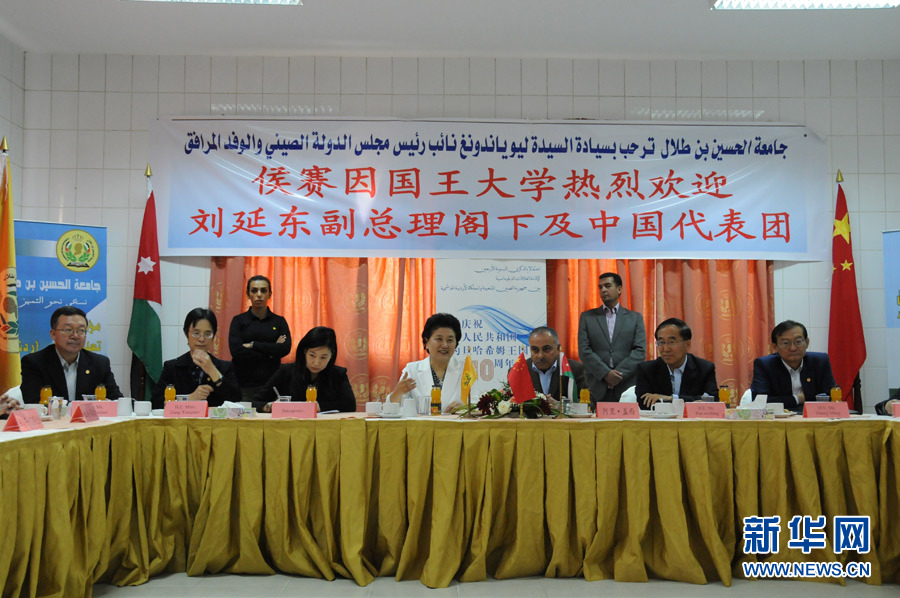 4月21日,在约旦佩特拉,中国国务院副总理刘延东(中)访问约旦侯赛因国王大学。 新华社记者林晓蔚摄