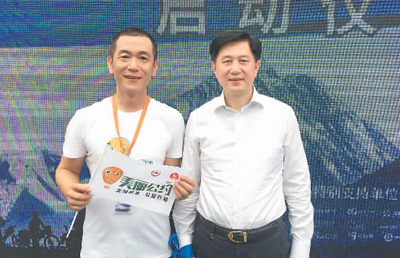 在“美丽公约 擦亮天路”启动仪式上,国家旅游局副局长王晓峰(右)与史宁合影。