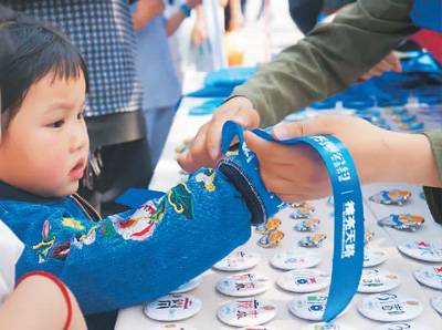 大理的互动宣传岗上,志愿者为小朋友系上蓝丝带。