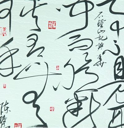 神形兼备,是“无边书法”的第三大特色。书法作品的内容,无论短字长句,均取自中国传世经典,形成对书法作品的厚重文化支撑,让观者在欣赏书法形式美的同时,深深浸润在中华文化博大精深的智慧中。书画相映,是“无边书法”的第四大特色。秉承中国传统“书画同源”的理念,一幅酣畅流利、黑白相间的作品,往往书画共存。有时,画是映衬底色,书法登堂彰显,画的浅绿底色衬托出字的黑白。或然书画同幅共色,不分彼此,浑然一体,横看如草书侧观似水墨。陈鹤良先生还大胆尝试引进红色,巧妙恰当地使用红色印章,让红色不规则地点缀在黑字白纸间,使书法平添出几分暖色,作品更是生动明亮起来。