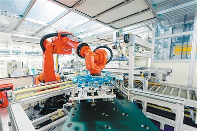 海信信息产业园的一条生产线上,机器人在工作。