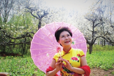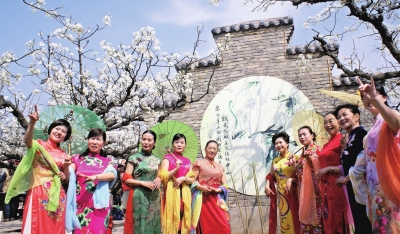 日前,安徽省亳州市旗袍协会的大妈们走进谯城区十九里镇梨园,举行旗袍走秀活动。“旗袍大妈”们展示旗袍时装,欣赏梨花绽放盛景,写书法、听戏曲,展示和体验乡土风情。 陈五志摄