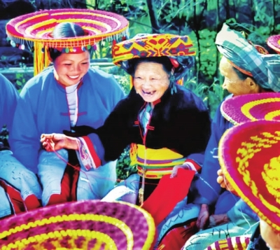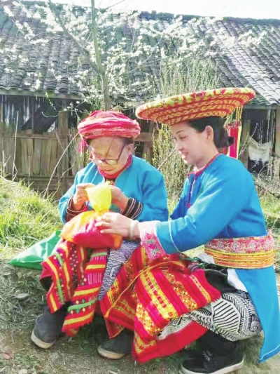 瑶族妇女在做刺绣。