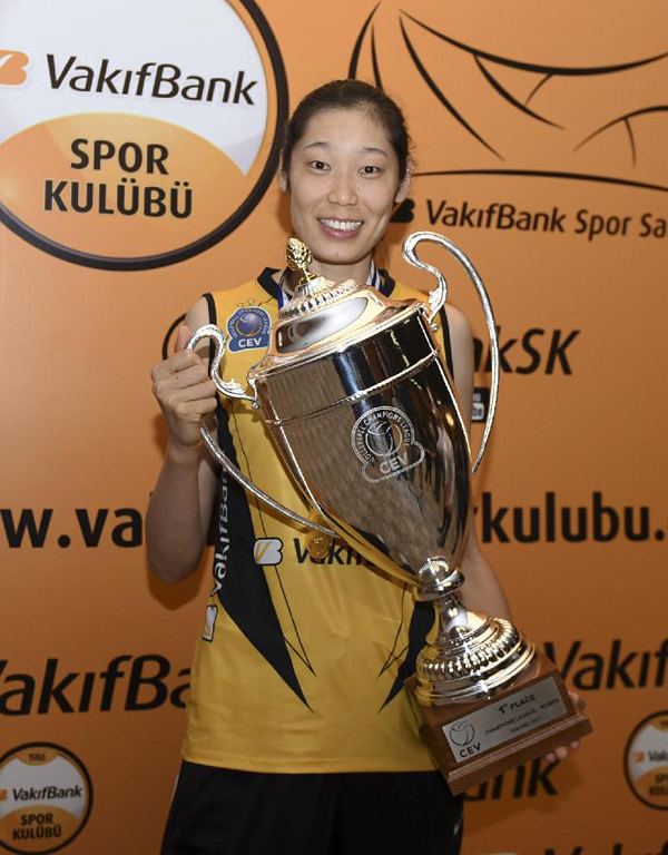 4月26日,瓦基弗银行队球员朱婷在新闻发布会上展示欧冠奖杯。当日,土耳其瓦基弗银行排球队在伊斯坦布尔举行新闻发布会,庆祝球队获得2016-2017欧洲女子排球冠军联赛冠军。