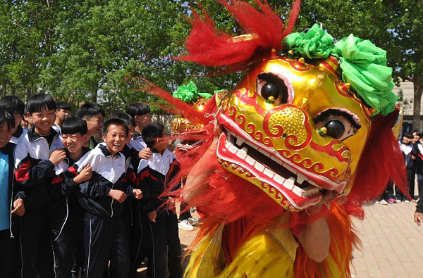 4月26日,河北沧县刘吉舞狮团的演员在沧县黄递铺中学表演狮舞。沧县狮舞是河北省的一种传统民俗舞蹈。2007年,沧县狮舞传承人、刘吉舞狮团团长尹少山和妻子卢春玲创办了“刘吉舞狮传习所”,免费教青年学习狮舞,并定期到周边学校传授技艺。