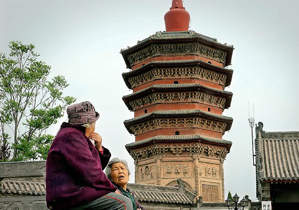 4月25日,两位老人坐在文峰塔前聊天。在河南省安阳市,有一座与众不同的“怪塔”——它上大下小,形如“倒立”。这座古塔叫文峰塔,也称天宁寺塔,始建于五代后周时期,已有一千余年历史。文峰塔塔身有五层重檐,一反常态地从下往上逐级增大,呈伞状形式,实为国内外所罕见。按照常理,“倒立”结构的砖塔容易倒塌,而文峰塔却能安如磐石屹立千年,甚至没有任何倾斜。对此,许多专家学者都进行过调查考证,但至今没有找出令人信服的解释。