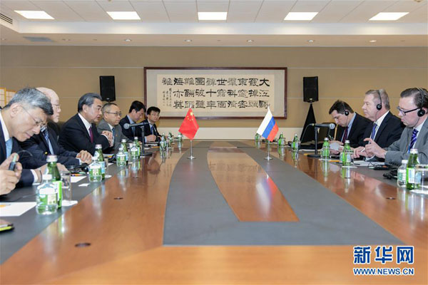 4月27日,在纽约出席联合国安理会朝鲜半岛核问题部长级公开会的中国外交部长王毅(左三)会见俄罗斯副外长加季洛夫(右二)。新华社记者李木子摄