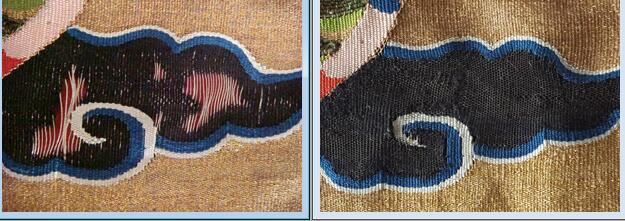 图为修复师栾桂芝去年修复的传世珍品缂丝蟒袍修复前后对比图 /首都博物馆供图