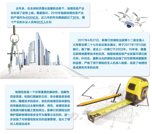 2017年4月27日,新修订的测绘法获第十二届全国人大常委会第二十七次会议表决通过,将于2017年7月1日起施行。据了解,该法上一次修订于2002年。15年来,随着互联网地图等技术的应用,我国地理信息产业发展可谓日新月异。针对此,最新出台的测绘法加强了对互联网地图服务的监管、严格了用于测绘的无人机准入制度、促进了地理信息成果的共享和应用。