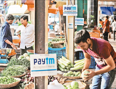 随着移动支付市场蓬勃发展,越来越多印度人接受移动支付。图为在孟买街头的一个菜市场,顾客可以通过印度本土移动支付服务商Paytm扫码消费。