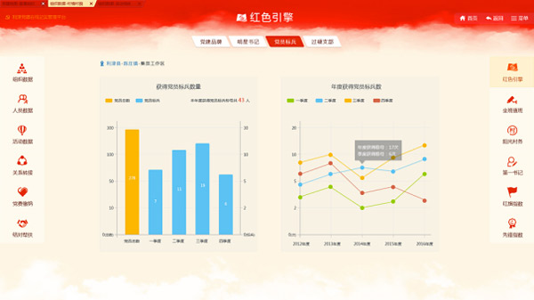 平台对基层党组织的各项工作进行实时记录,量化统计完成率,软件后台根据各项任务的数据权重,自动汇总生成反映党员在支部内排名的先锋指数和支部在党委内排名的红旗指数,作为评价党员和基层党组织的重要依据,实现了党建工作考核的数据化,有效解决了党建工作考核不科学、不准确的问题。