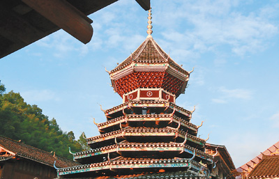 鼓楼以置放有“信鼓”而得名,是人们“集众议事”“执行款约”“踩堂祭祖”“鼓楼葬礼”“迎宾送客”“休息娱乐”的场所,也是侗寨政治、文化活动的中心。鼓楼的建造也堪称世界建筑工艺中的一绝,整个建筑不用一根铁钉,全凭榫卯相连,结构牢固;而在建造之初,工匠们不绘一张图纸,整个结构烂熟于心。