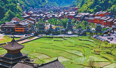 肇兴侗寨坐落在一条狭长的船形谷地中,全寨1012户、4146人,是全国最大的侗族自然村寨之一,被誉为“侗乡第一寨”。村寨四面环山,小河从寨中蜿蜒流过,村寨建筑皆为青瓦吊脚木楼,鳞次栉比,疏密有致。寨中歌坪、禾晾、谷仓、瓢井布局合理,鼓楼、花桥、戏台古朴宁静。