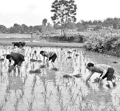 5月7日,四川省广安市广安区彭家乡党员干部来到茶店村1组,为低保贫困户栽插水稻。在大春“双抢”时节,广安区组织区级部门、乡镇及村组党员干部成立义务助耕小分队,深入贫困村扶贫助贫,帮助结对帮扶贫困户抢种抢收。 张国盛摄/光明图片