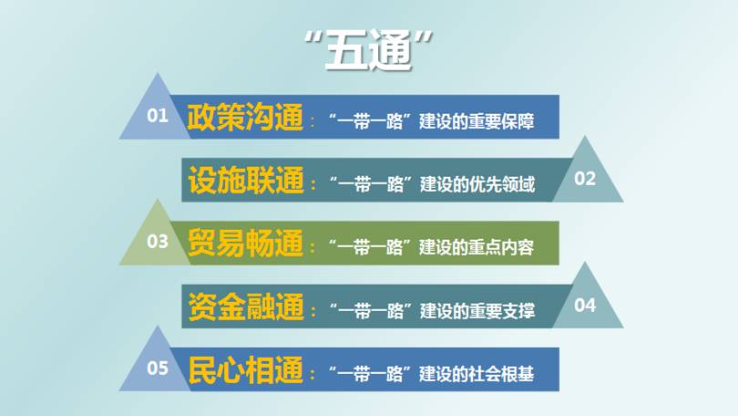 其实,以上那些看得见、摸得着的基础设施项目只是其中一个重要方面。“一带一路”共有五大合作重点:政策沟通、设施联通、贸易畅通、资金融通和民心相通,也被称为“五通”。