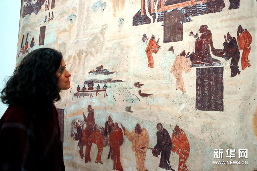 5月8日,在奥地利维也纳,一名参观者在2017联合国中文日活动“丝路·敦煌壁画精品展走进联合国”开幕式上观看展品。 2017联合国中文日活动“丝路·敦煌壁画精品展走进联合国”8日在维也纳联合国大厅开幕,来自敦煌的中国艺术瑰宝向各国友人展示其独有的艺术魅力。此次展览共带来40幅大型数码高清壁画,同时还展示了一比一仿真的莫高窟285号洞窟。