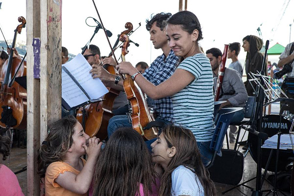 5月10日,在希腊比雷埃夫斯附近的斯卡拉马加斯难民营,小难民围坐在委内瑞拉加拉加斯市政青年交响乐团的乐手旁聆听音乐。当日,交响乐团来到斯卡拉马加斯难民营,为难民举行了一场特别的音乐会。斯卡拉马加斯本是一处废弃的工业园区,希腊政府将这里的410个集装箱改造成房屋,供约3500名难民栖身。这些主要来自叙利亚、伊拉克、阿富汗等国家的难民,是从巴尔干半岛前往中欧的通道被关闭后被迫滞留在希腊的约6.2万名难民中的一部分。
