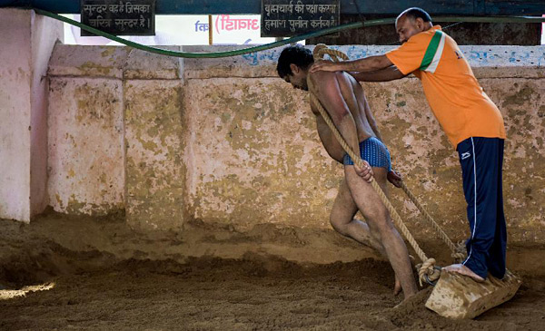 5月2日,在位于新德里的哈奴曼宗师摔跤中心,泥地摔跤手背拉条石轧平泥地,这也是摔跤手力量训练的一种方式。印度传统泥地摔跤又称古什蒂(Kushti),是流行于南亚特别是印度北部地区的摔跤形式。这一运动在莫卧儿王朝时期传入印度,并与印度原有的摔跤形式融合,流传至今。