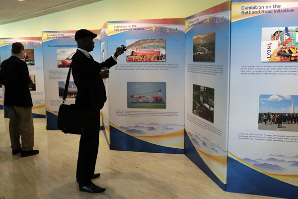 5月8日,在位于纽约的联合国总部,参观者在“一带一路”图片展上拍照。“加强国际合作,实现共赢发展——‘一带一路’图片展”8日傍晚在联合国总部开幕。图片展为期一周,由中国常驻联合国代表团和新华社北美总分社共同举办,展览通过政策沟通、设施联通、贸易畅通、资金融通、民心相通等五个板块,全方位展现“一带一路”的发展理念、阶段性成就和深远意义。