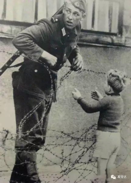 一位士兵正偷偷帮一位小朋友越过“柏林墙”,到这边来和家人团聚 ▼