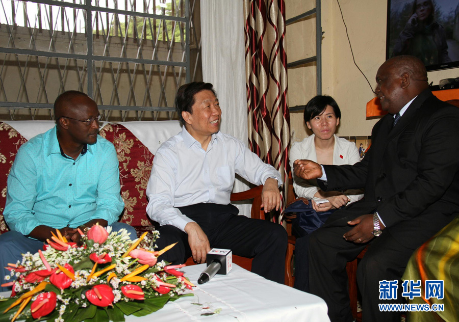 5月12日,在布隆迪首都布琼布拉,正在布隆迪访问的中国国家副主席李源潮(左二)在布第一副总统辛迪姆沃(左一)陪同下,专门来到布隆迪大学教授劳塞夫(右一)家中走访,受到了劳塞夫一家的热情欢迎和接待。新华社记者吕天然摄