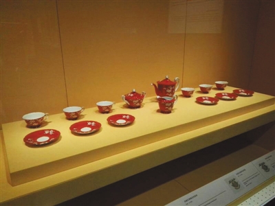 这组茶具由茶壶、糖罐、奶杯、盘、杯组成,这十五件藏品通体为红色釉,上面绘有梅花纹饰,产自于日本“则武”瓷厂,该厂以制造西式瓷质餐具而闻名于世。