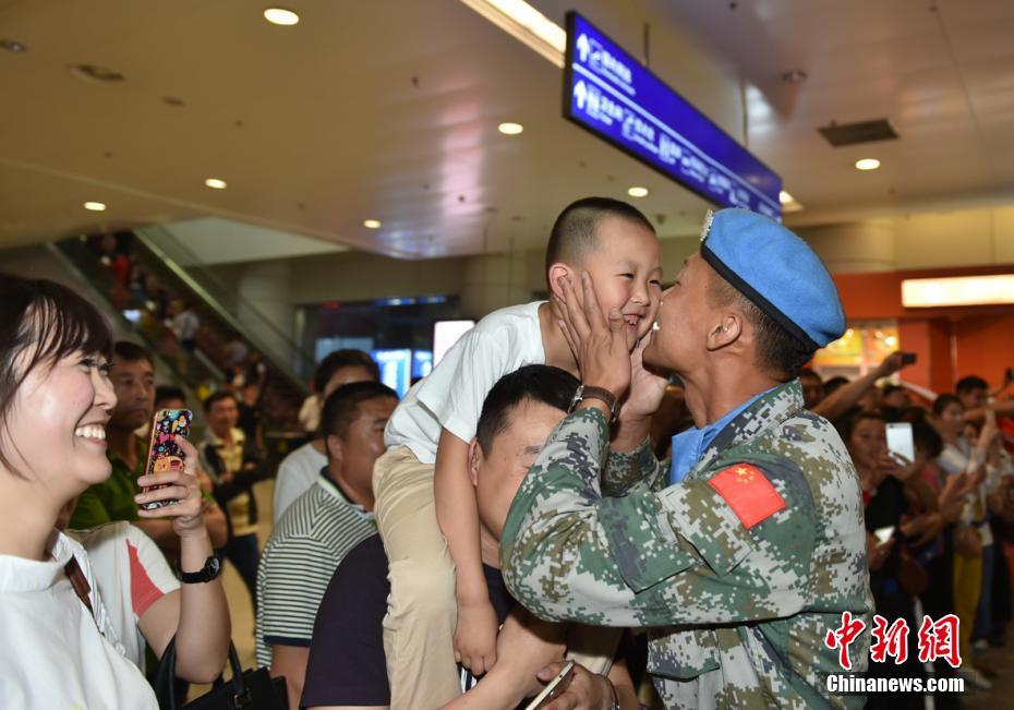 5月18日,中国第四批赴马里维和部队第一梯队200名官兵顺利完成联合国赋予的维和任务后,乘专机抵达长春龙嘉国际机场。陆军第78集团军与驻地政府领导共同举行仪式,热烈欢迎蓝盔勇士凯旋。图为指导员程广洲亲吻分别了一年有余的儿子。中新社发 杨再新 摄