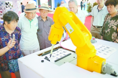 5月18日,在安徽合肥举行的第十届中国中部投资贸易博览会上,主展馆内近8万平方米的展览区云集各种高科技产品,吸引了众多观众目光。图为现场展示的智能书法机器人。
