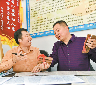 近日,山西运城市司法行政部门围绕服务和保障民生,深入乡村普法,并组织开展法律援助。图为运城市临猗县嵋阳镇司法所所长陈剑(左)与村民王国文一起编排普法快板。