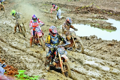 5月20日,2017中国桂林“龙光·普罗旺斯”杯超级越野摩托车场地赛在广西桂林市象山区举行,来自全国各地的120多名摩托赛车手们展开激烈角逐,上演了一场速度与激情的视觉盛宴。图为参赛选手驾驶摩托车在泥泞的赛道上激烈角逐。