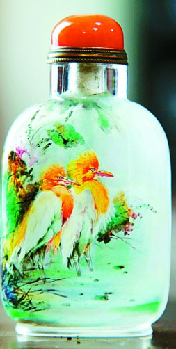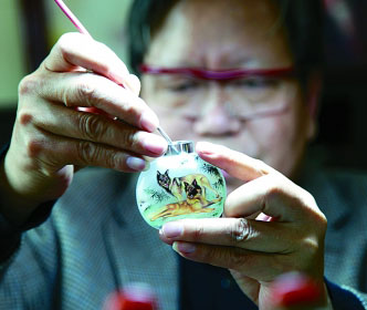 内画鼻烟壶是汉族特有的传统工艺,始于清嘉庆年间,经过几百年发展,可分为京、冀、鲁、粤四大流派。它综合料器、书法、绘画等诸多艺术元素,涵盖了诸多手工艺行业的精湛技艺。传统的内画大都是画在玻璃、水晶等透明或半透明的鼻烟壶内侧,要经过磨型、雕刻、掏膛等一套工艺方能制作而成。近年来,内画艺术家们在继承传统的基础上不断创新,题材逐渐扩展到人物、山水、动物等诸多领域。技法上也采用了国画、油画、泼彩、书法等,使中西技法融为一体。图为河北省深州市冀派内画鼻烟壶传承人张增楼在创作。 高占峰摄/光明图片