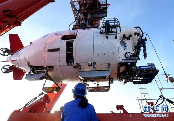 5月25日,刚从深海归来的“蛟龙”号。当日,“蛟龙”号载人潜水器在马里亚纳海沟成功找到一年前因特殊情况留在了6300米大洋深处的采水器,“大海捞针”的故事变为现实。新华社记者 刘诗平摄