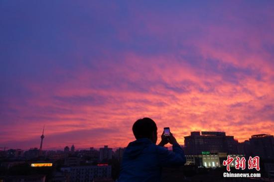 资料图:北京雨后现壮美火烧云,民众拍摄美景。 中新社记者 苏丹 摄