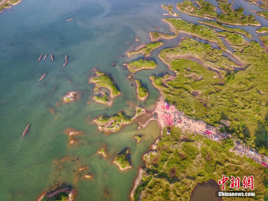 航拍江西乐平“最美龙舟赛道” 碧水绿岛夕阳相映成景