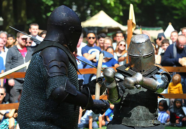 6月4日,在比利时首都布鲁塞尔举行的中世纪节上,两名“中世纪武士”在比武。 一场精彩的中世纪节4日在这里上演,吸引了大批的参观者。